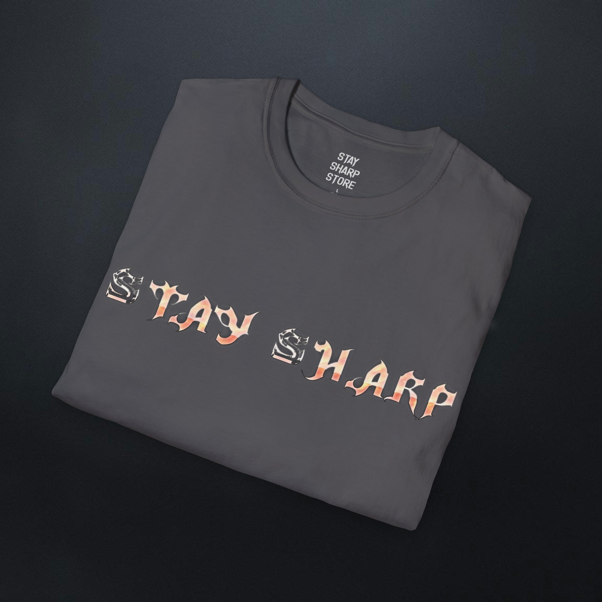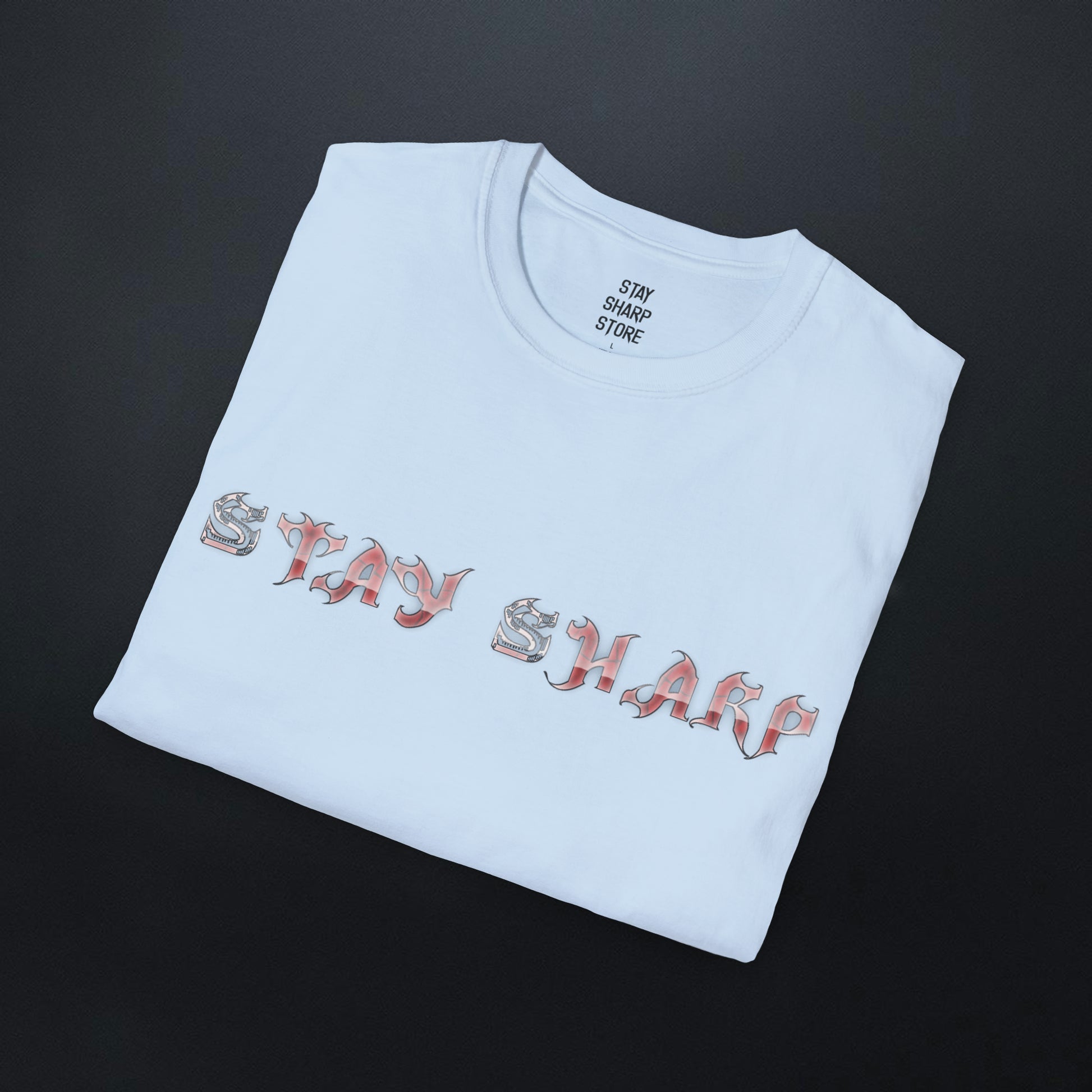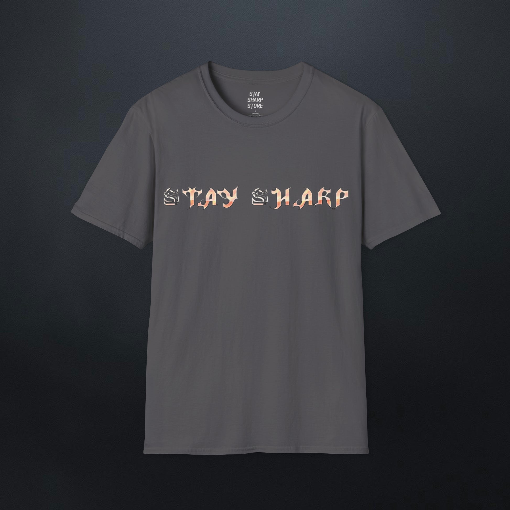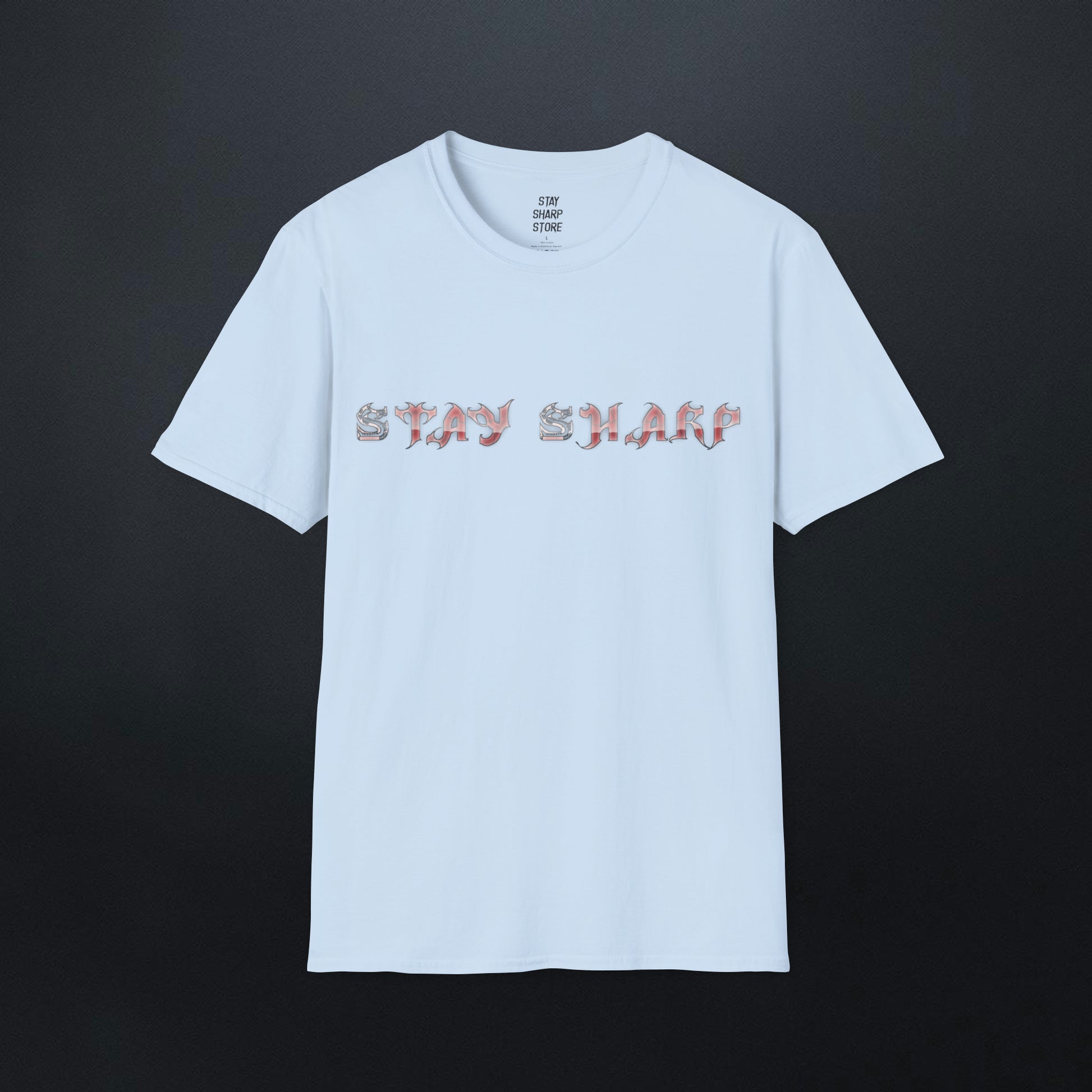 The Stay Sharp unisex soft-style t-shirt puts a Sharp Edge on casual comfort. Made from very soft materials, this tee is 100% cotton. The shoulders have twill tape for improved durability. There are no side seams. The collar is made with ribbed knitting to prevent curling damage.